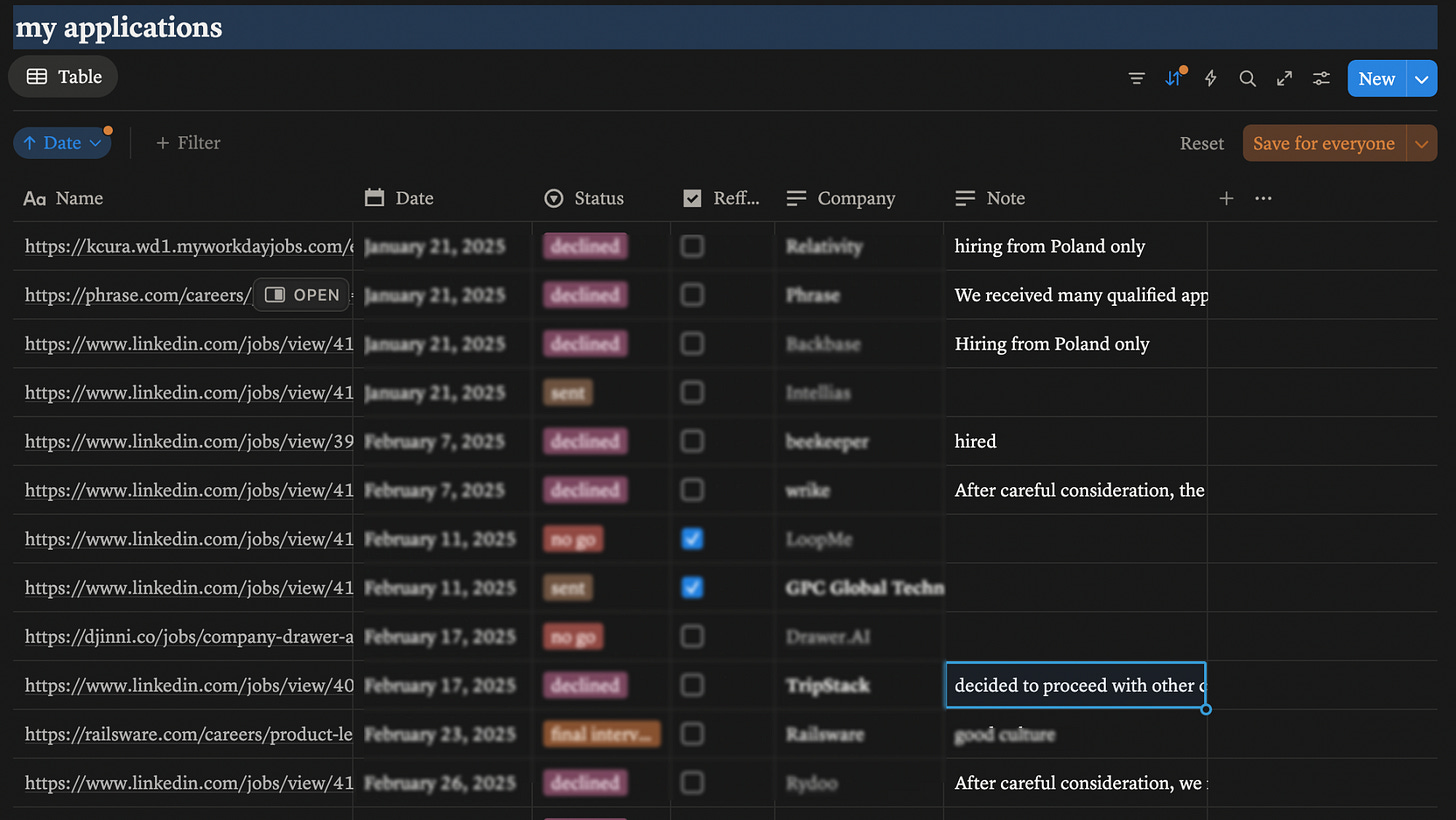 Every company, feedback, stage, salary expectation — documented like I’m preparing for a court case.