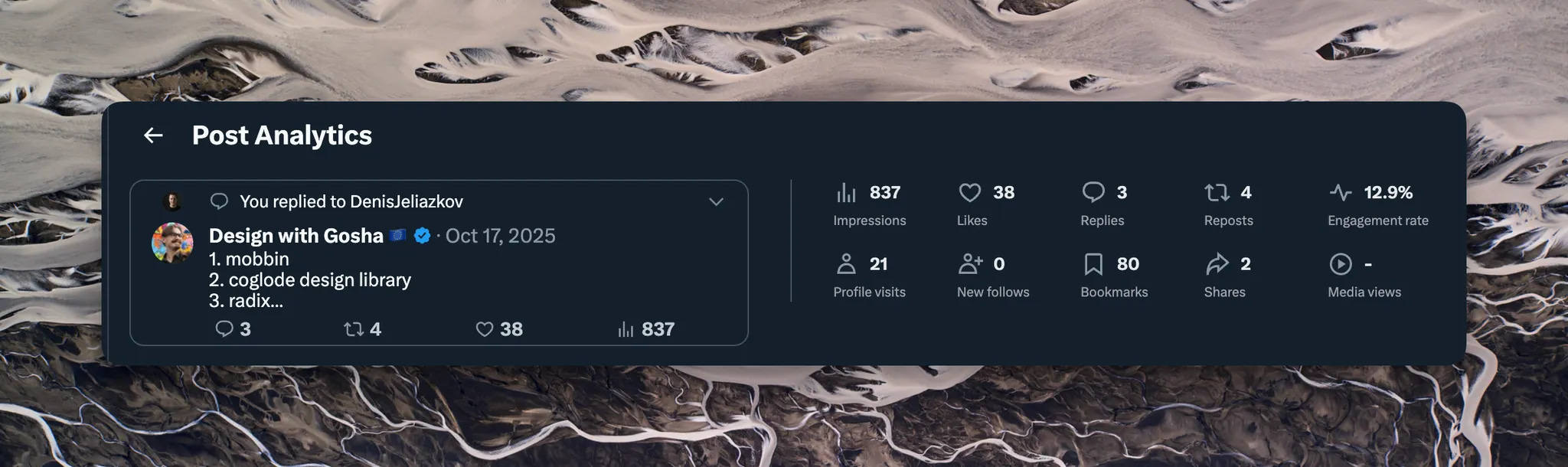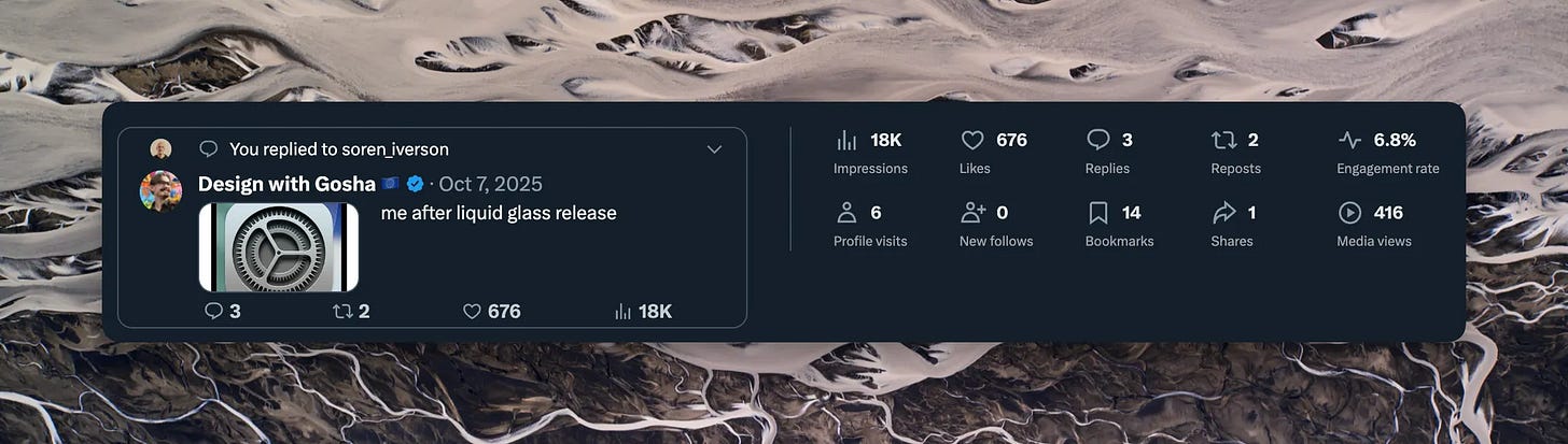 Most viewed piece of content: https://x.com/withgosha/status/1975622406288105974